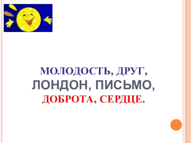Слайд 6МОЛОДОСТЬ, ДРУГ, ЛОНДОН, ПИСЬМО, ДОБРОТА, СЕРДЦЕ.