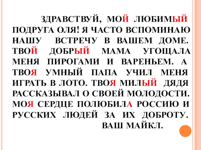 НАШУ ВСТРЕЧУ В ВАШЕМ ДОМЕ. ТВОЙ ДОБРЫЙ МАМА УГОЩАЛА МЕНЯ ПИРОГАМИ И ВАРЕНЬЕМ. А ТВОЯ УМНЫЙ ПАПА УЧИЛ МЕНЯ ИГРАТЬ В ЛОТО. ТВОЯ МИЛЫЙ ДЯДЯ РАССКАЗЫВАЛ О СВОЕЙ МОЛОДОСТИ. МОЯ СЕРДЦЕ ПОЛЮБИЛА РОССИЮ И РУССКИХ ЛЮДЕЙ ЗА ИХ ДОБРОТУ. ВАШ МАЙКЛ.