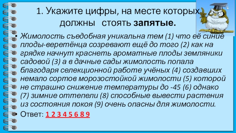 Жимолость съедобная уникальна тем (1) что её синие плоды-веретёнца созревают ещё до того (2) как на грядке начнут краснеть ароматные плоды земляники садовой (3) а в дачные сады жимолость попала благодаря селекционной работе учёных (4) создавших немало сортов морозостойкой жимолости (5) которой не страшно снижение температуры до -45 (6) однако (7) зимние оттепели (8) способные вывести растения из состояния покоя (9) очень опасны для жимолости.