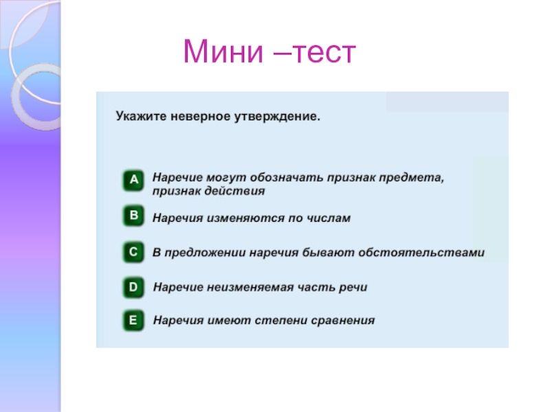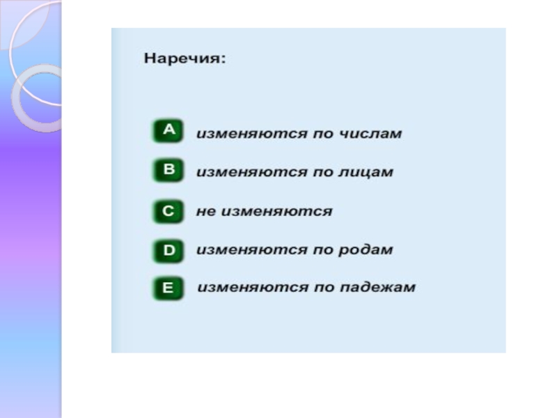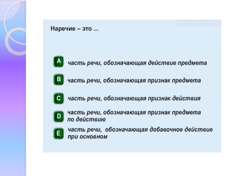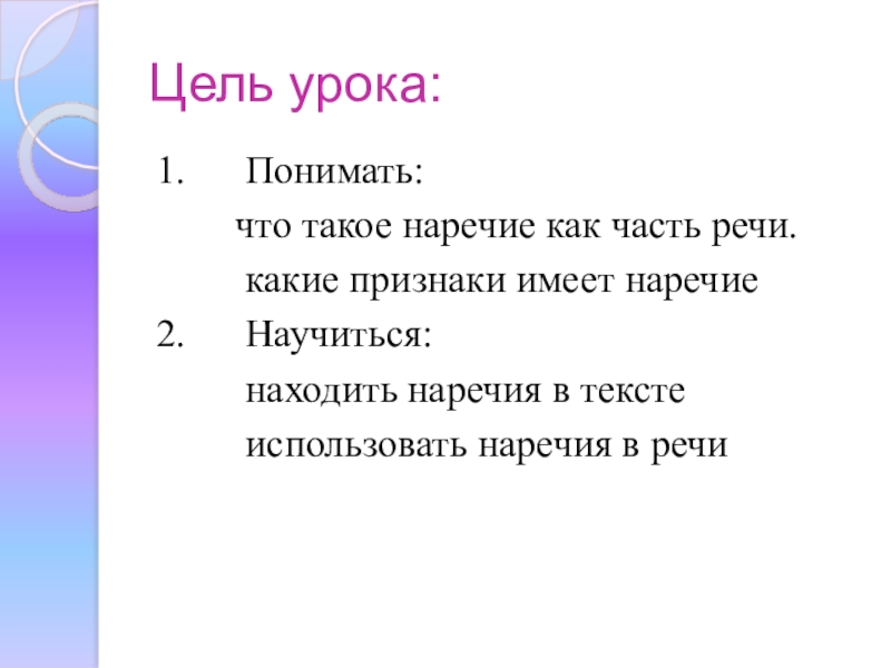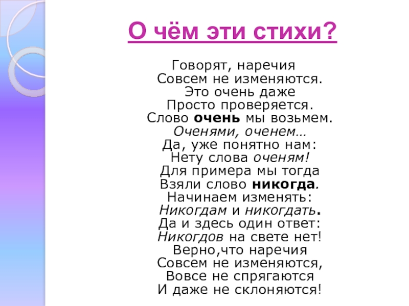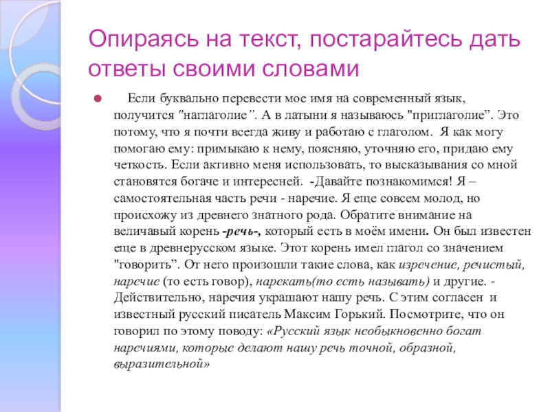 перевести мое имя на современный язык, получится "наглаголие”. А в латыни я называюсь "приглаголие”. Это потому, что я почти всегда живу и работаю с глаголом. Я как могу помогаю ему: примыкаю к нему, поясняю, уточняю его, придаю ему четкость. Если активно меня использовать, то высказывания со мной становятся богаче и интересней. -Давайте познакомимся! Я – самостоятельная часть речи - наречие. Я еще совсем молод, но происхожу из древнего знатного рода. Обратите внимание на величавый корень -речь-, который есть в моём имени. Он был известен еще в древнерусском языке. Этот корень имел глагол со значением "говорить”. От него произошли такие слова, как изречение, речистый, наречие (то есть говор), нарекать(то есть называть) и другие. - Действительно, наречия украшают нашу речь. С этим согласен и известный русский писатель Максим Горький. Посмотрите, что он говорил по этому поводу: «Русский язык необыкновенно богат наречиями, которые делают нашу речь точной, образной, выразительной»