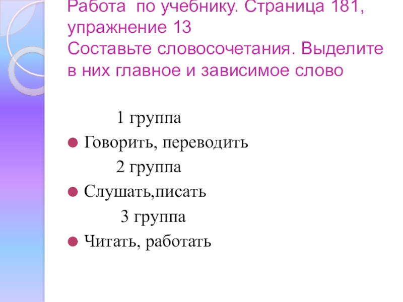 Слайд 21Работа по учебнику. Страница 181, упражнение 13