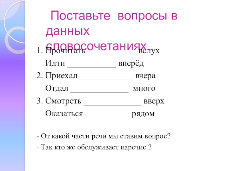 Слайд 15 Поставьте вопросы в данных словосочетаниях.