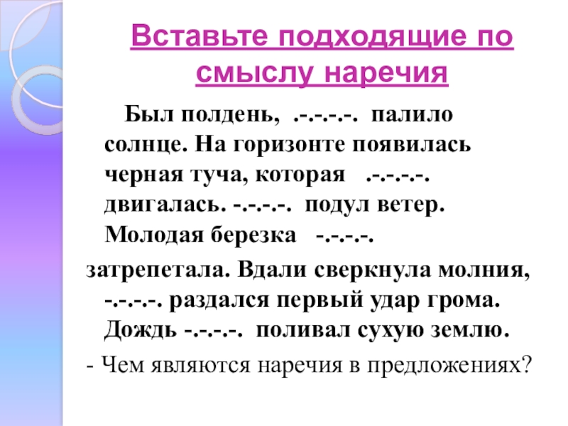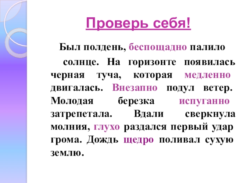 солнце. На горизонте появилась черная туча, которая .-.-.-.-. двигалась. -.-.-.-. подул ветер. Молодая березка -.-.-.-.