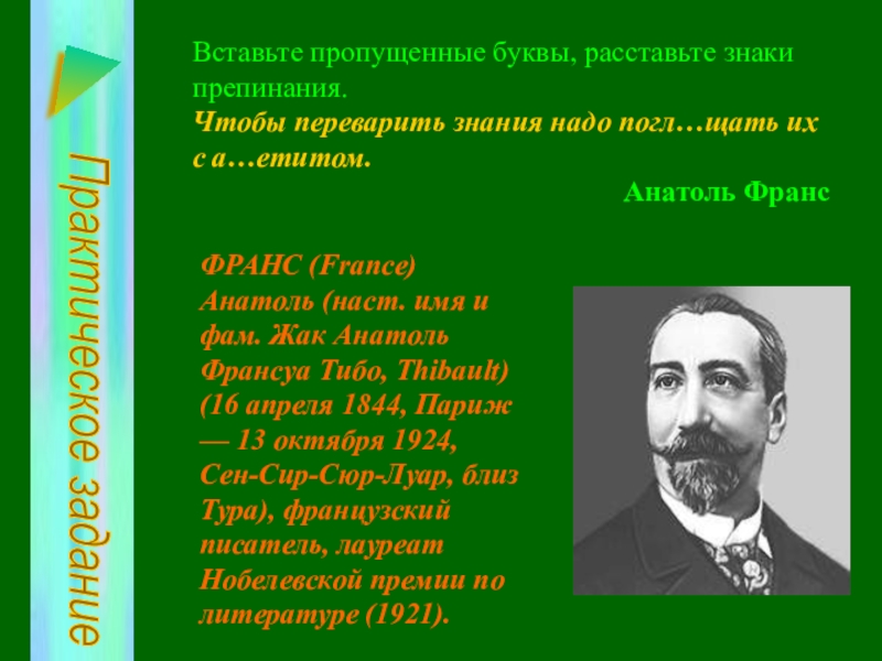 ФРАНС (France) Анатоль (наст. имя и фам. Жак Анатоль Франсуа Тибо, Thibault) (16 апреля 1844, Париж — 13 октября 1924, Сен-Сир-Сюр-Луар, близ Тура), французский писатель, лауреат Нобелевской премии по литературе (1921).