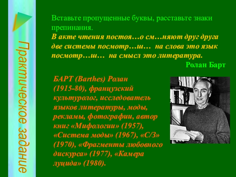 БАРТ (Barthes) Ролан (1915-80), французский культуролог, исследователь языков литературы, моды, рекламы, фотографии, автор книг «Мифологии» (1957), «Система моды» (1967), «С/З» (1970), «Фрагменты любовного дискурса» (1977), «Камера луцида» (1980).