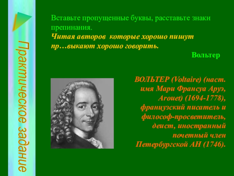 ВОЛЬТЕР (Voltaire) (наст. имя Мари Франсуа Аруэ, Arouet) (1694-1778), французский писатель и философ-просветитель, деист, иностранный почетный член Петербургской АН (1746).