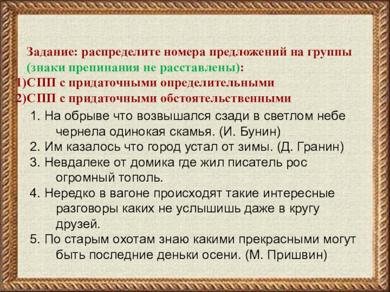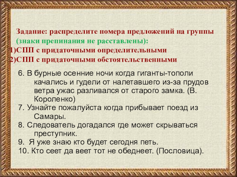 Задание: распределите номера предложений на группы (знаки препинания не расставлены):