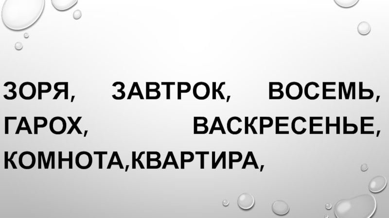Слайд 3Зоря, завтрок, восемь, гарох, васкресенье,комнота,квартира,