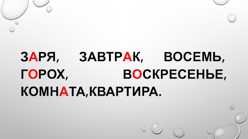 Слайд 4Заря, завтрак, восемь, горох, воскресенье,комната,квартира.
