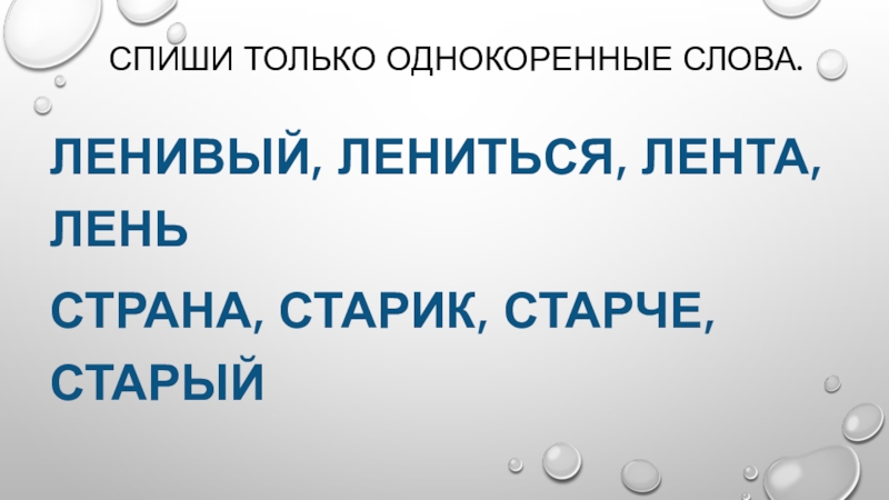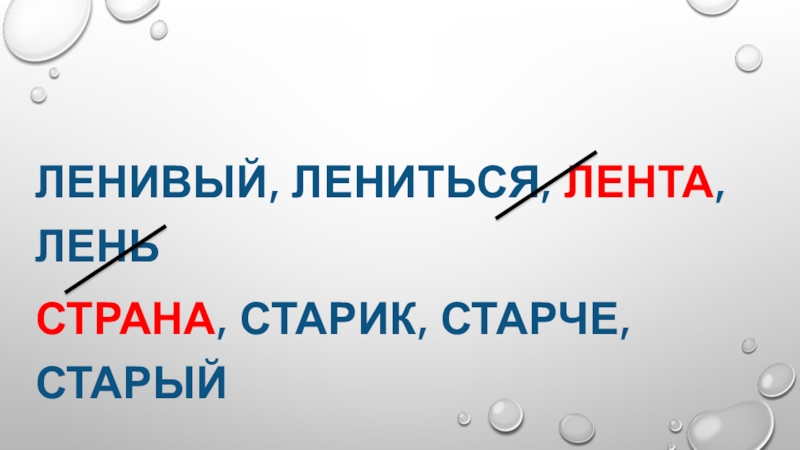 Спиши только однокоренные слова.Ленивый, лениться, лента, леньСтрана, Старик, старче, старый