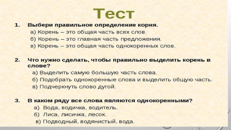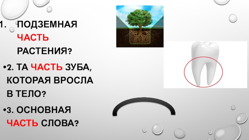 Подземная часть растения?2. та часть зуба, которая вросла в тело?3. основная часть слова?