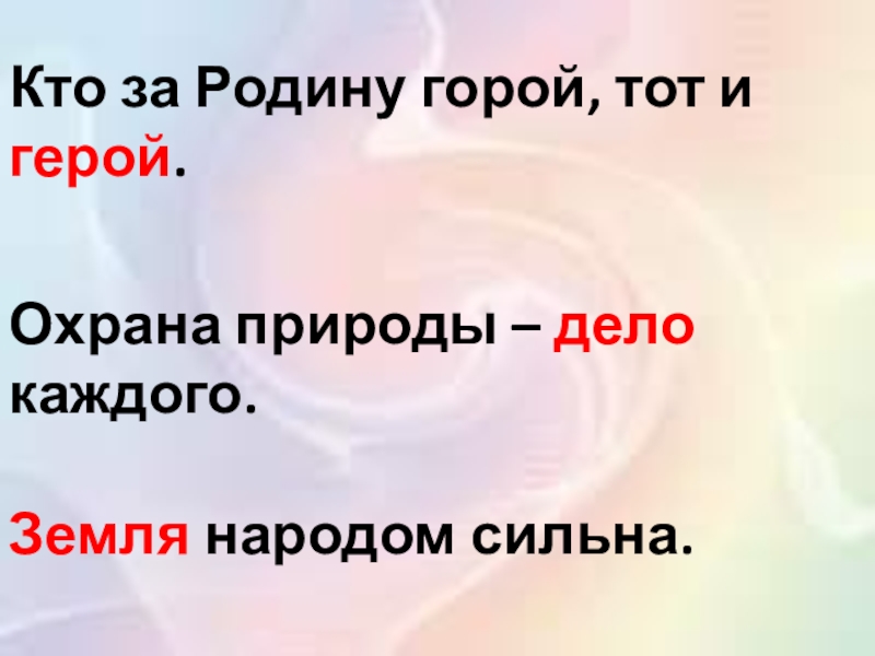 Кто за Родину горой, тот и герой.Охрана природы – дело каждого. Земля народом сильна.