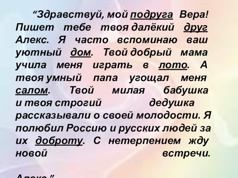 вспоминаю ваш уютный дом. Твой добрый мама учила меня играть в лото. А твоя умный папа угощал меня салом. Твой милая бабушка и твоя строгий дедушка рассказывали о своей молодости. Я полюбил Россию и русских людей за их доброту. С нетерпением жду новой встречи. Алекс.”