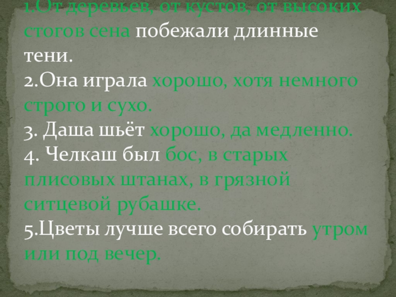 1.От деревьев, от кустов, от высоких стогов сена побежали длинные тени.  2.Она играла хорошо, хотя немного