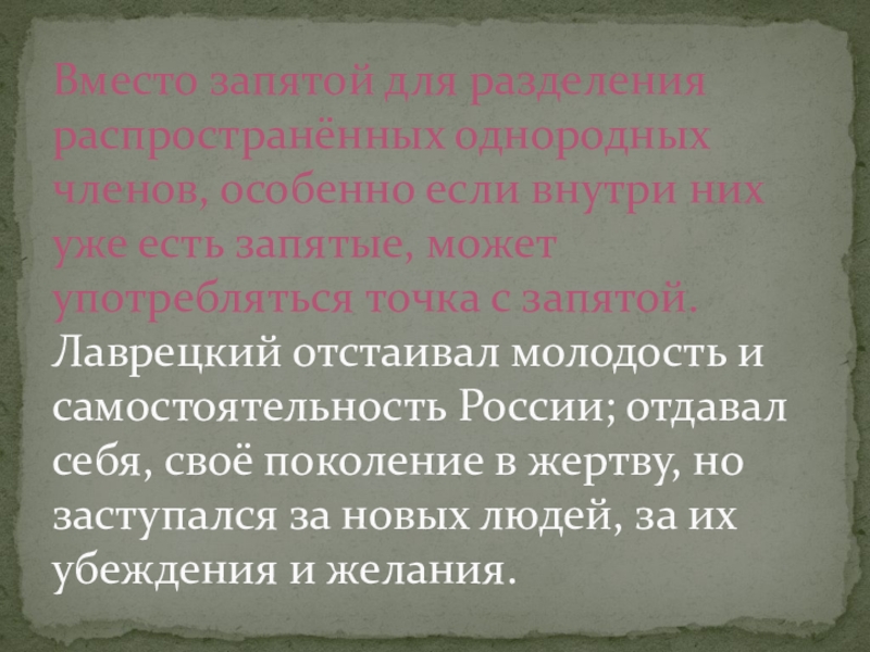 уже есть запятые, может употребляться точка с запятой. Лаврецкий отстаивал молодость и самостоятельность России; отдавал себя, своё поколение в жертву, но заступался за новых людей, за их убеждения и желания.