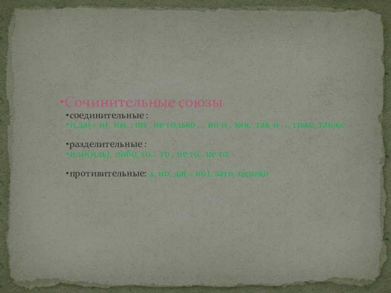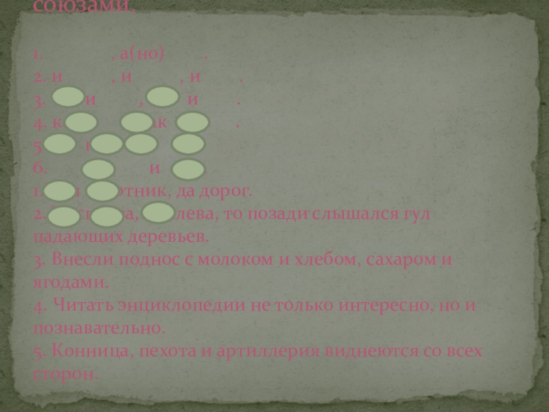 , а(но) . 2. и , и , и . 3. и , и . 4. как , так и . 5. и . 6. , и . 1.Мал золотник, да дорог. 2. То справа, то слева, то позади слышался гул падающих деревьев. 3. Внесли поднос с молоком и хлебом, сахаром и ягодами. 4. Читать энциклопедии не только интересно, но и познавательно. 5. Конница, пехота и артиллерия виднеются со всех сторон.