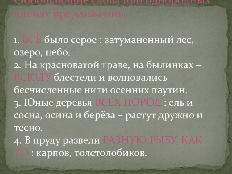 Обобщающие слова при однородных членах предложения.  1. ВСЁ было серое : затуманенный лес, озеро, небо. 2.