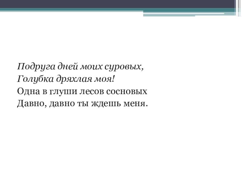 Подруга дней моих суровых,Голубка дряхлая моя!Одна в глуши лесов сосновыхДавно, давно ты ждешь меня.