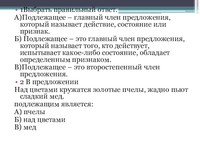 1Выбрать правильный ответ.А)Подлежащее – главный член предложения, который называет действие, состояние или признак.Б) Подлежащее – это главный