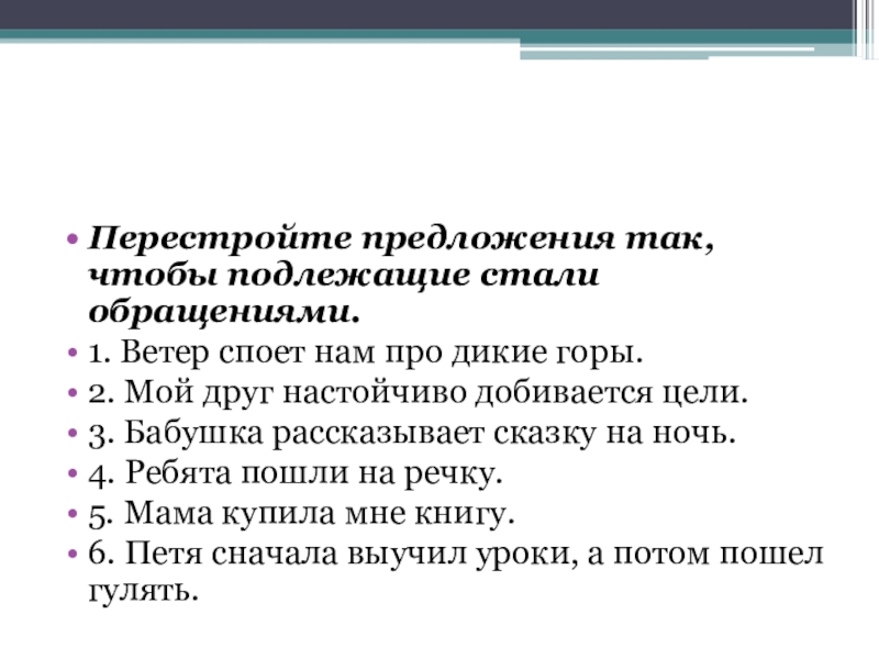 Перестройте предложения так, чтобы подлежащие стали обращениями.1. Ветер споет нам про дикие горы.2. Мой друг настойчиво добивается