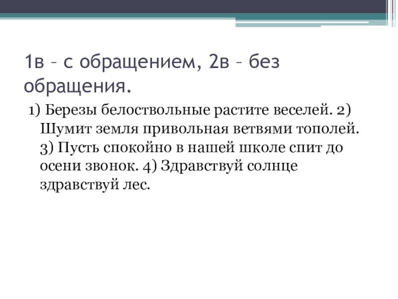 1в – с обращением, 2в – без обращения.1) Березы белоствольные растите веселей. 2) Шумит земля привольная ветвями