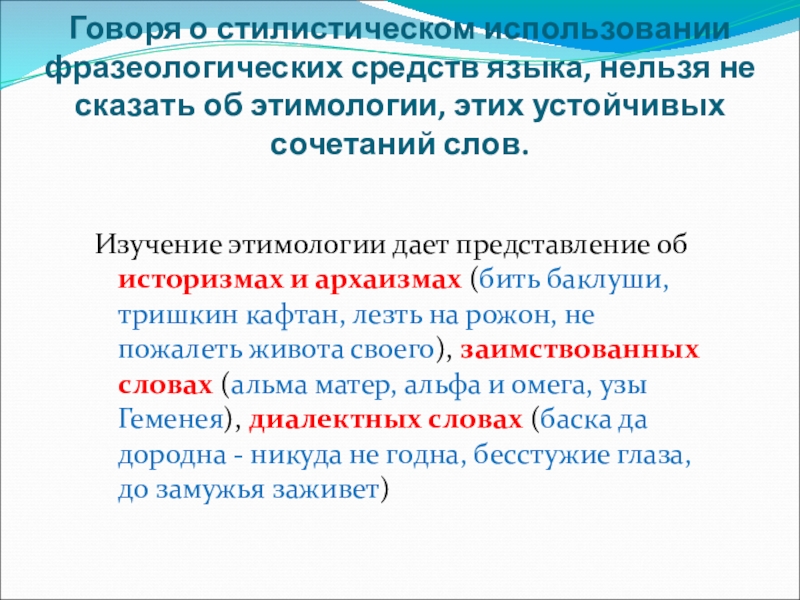 Изучение этимологии дает представление об историзмах и архаизмах (бить баклуши, тришкин кафтан, лезть на рожон, не пожалеть живота своего), заимствованных словах (альма матер, альфа и омега, узы Геменея), диалектных словах (баска да дородна - никуда не годна, бесстужие глаза, до замужья заживет)