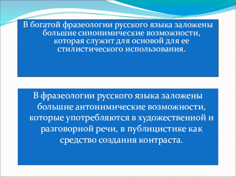 В фразеологии русского языка заложены большие антонимические возможности, которые употребляются в художественной и разговорной речи, в публицистике как средство создания контраста.