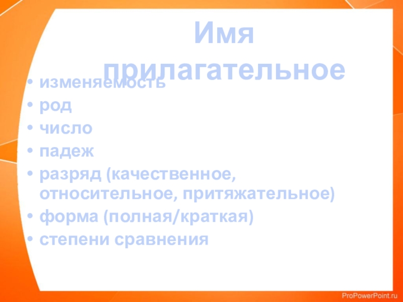 изменяемостьродчислопадежразряд (качественное, относительное, притяжательное)форма (полная/краткая)степени сравненияИмя прилагательное