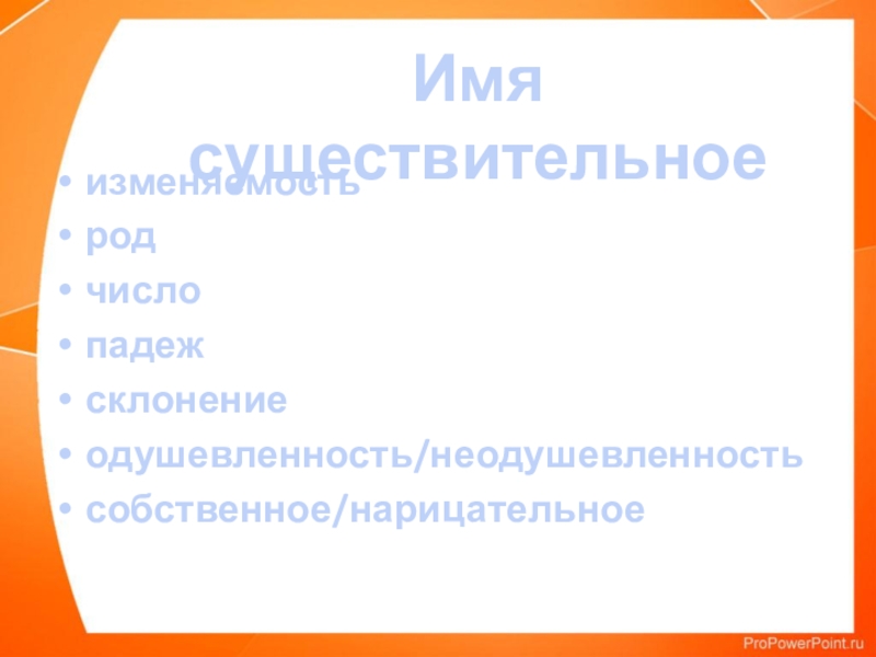 изменяемостьродчислопадежсклонениеодушевленность/неодушевленностьсобственное/нарицательноеИмя существительное