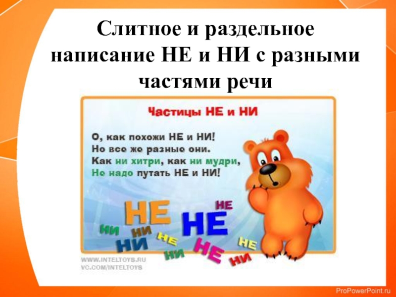 Слайд 1Слитное и раздельное написание НЕ и НИ с разными частями речи