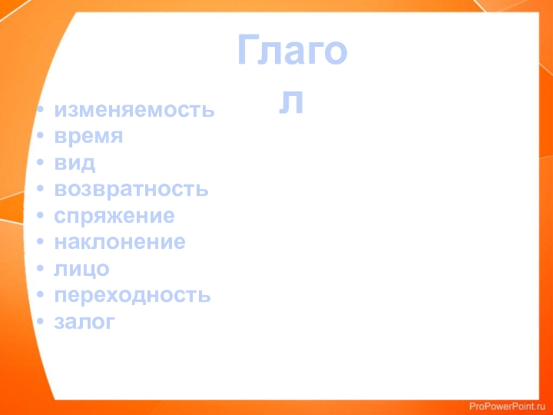изменяемостьвремявидвозвратностьспряжениенаклонениелицопереходностьзалогГлагол