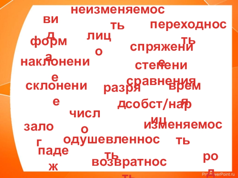падежчислородсклонениеодушевленностьсобст/нарицразрядформастепени сравнениявидвозвратностьпереходностьспряжениенаклонениелицоизменяемостьнеизменяемостьзалогвремя