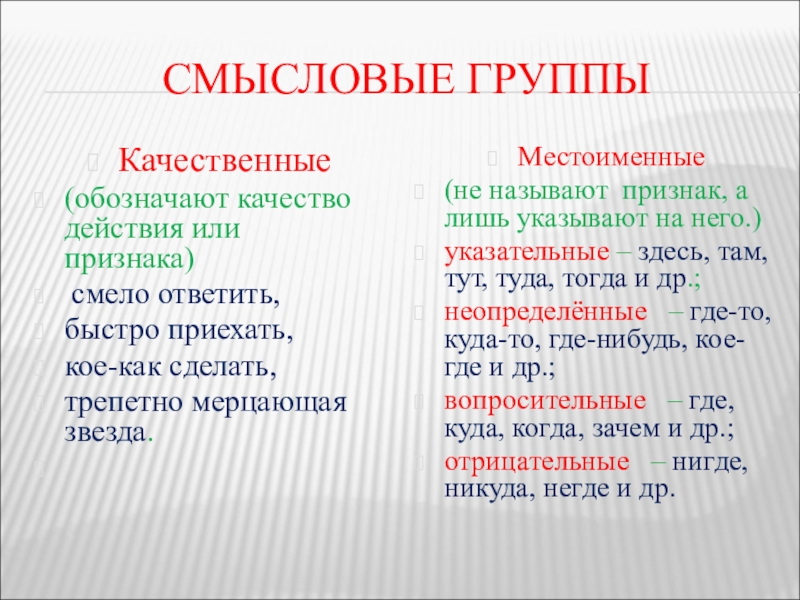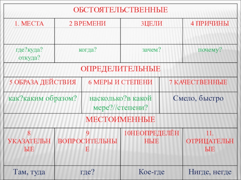 неопределённые – где-то, куда-то, где-нибудь, кое-где и др.;