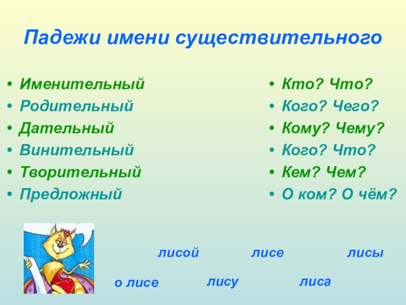 Падежи имени существительногоИменительныйРодительныйДательныйВинительныйТворительныйПредложныйКто? Что?Кого? Чего?Кому? Чему? Кого? Что? Кем? Чем?О ком? О чём?лисалисойлиселисулисыо лисе