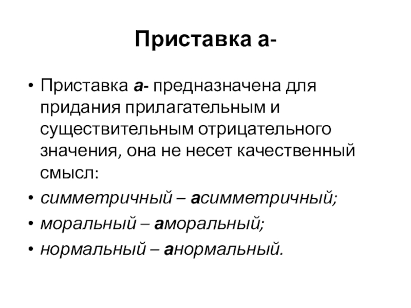 Приставка а- предназначена для придания прилагательным и существительным отрицательного значения, она не