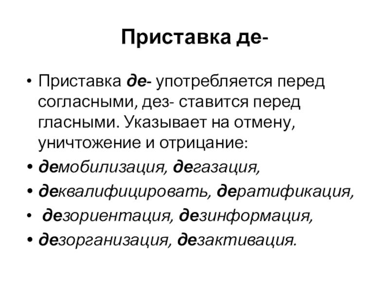 Приставка де- употребляется перед согласными, дез- ставится перед гласными. Указывает на отмену,