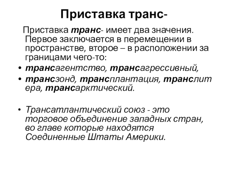 Приставка транс- имеет два значения. Первое заключается в перемещении