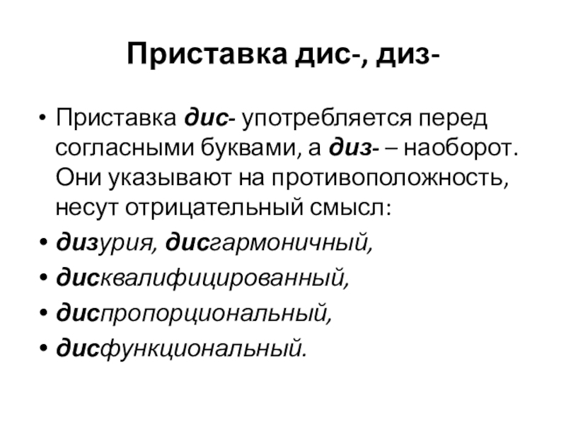 Приставка дис- употребляется перед согласными буквами, а диз- – наоборот. Они указывают на