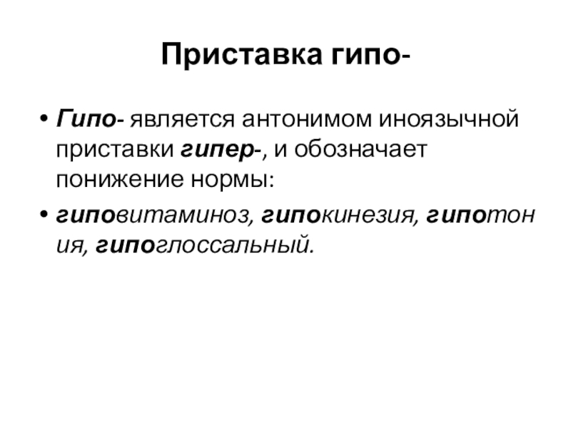 Слайд 20Гипо- является антонимом иноязычной приставки гипер-, и обозначает понижение нормы: