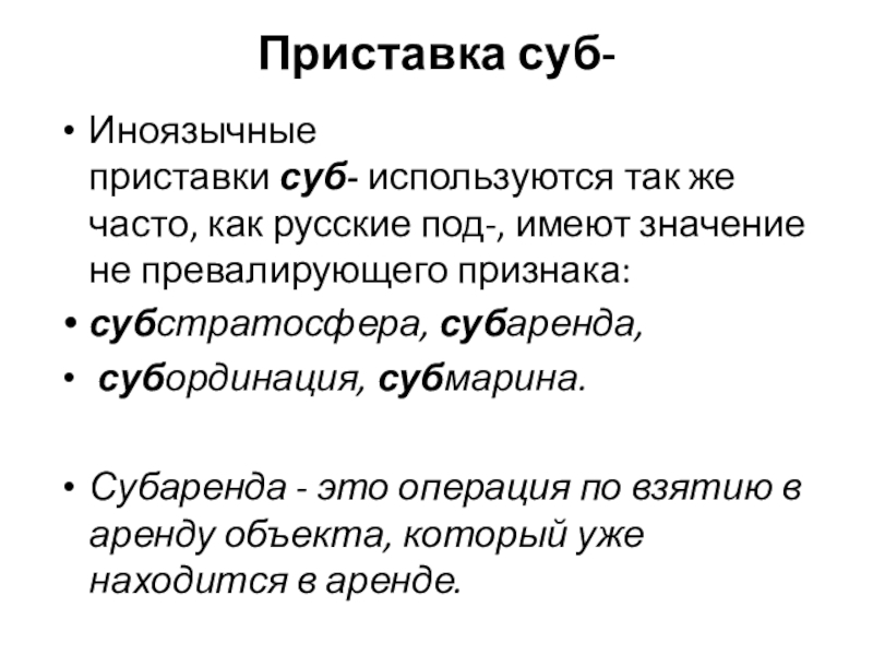 Иноязычные приставки суб- используются так же часто, как русские под-, имеют значение