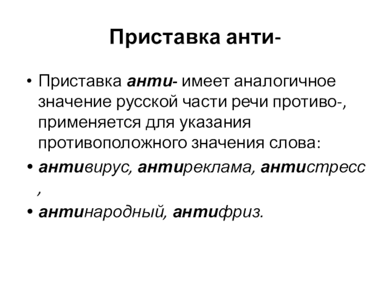 Приставка анти- имеет аналогичное значение русской части речи противо-, применяется для указания