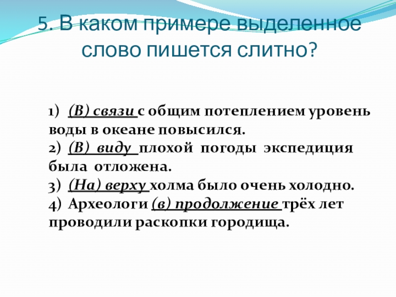 4) (В)СЛЕДСТВИЕ прошедших ливней река вышла из берегов и всё пространство (ВО)КРУГ было покрыто водой.