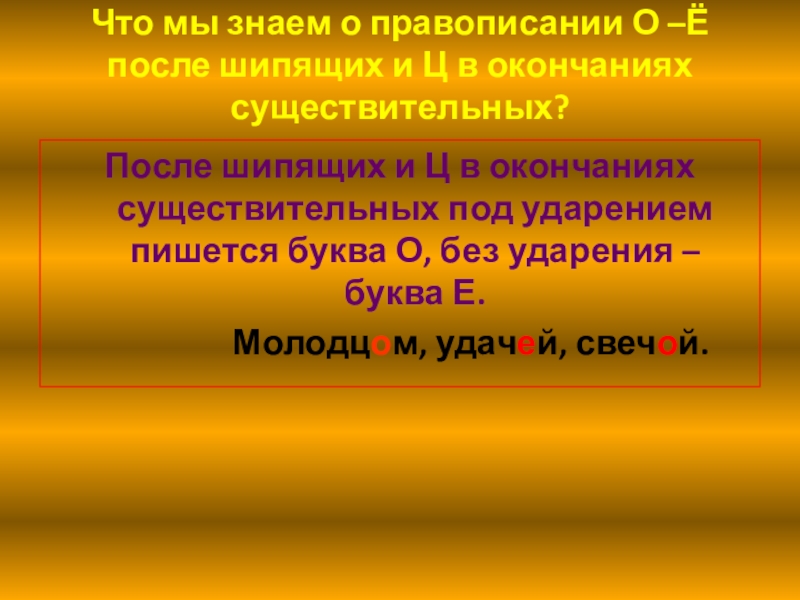 После шипящих и Ц в окончаниях существительных под ударением пишется буква О, без ударения – буква Е.