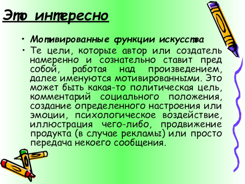 и сознательно ставит пред собой, работая над произведением, далее именуются мотивированными. Это может быть какая-то политическая цель, комментарий социального положения, создание определенного настроения или эмоции, психологическое воздействие, иллюстрация чего-либо, продвижение продукта (в случае рекламы) или просто передача некоего сообщения.