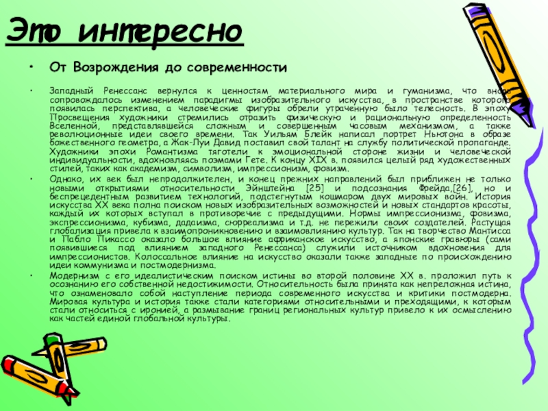 и гуманизма, что вновь сопровождалось изменением парадигмы изобразительного искусства, в пространстве которого появилась перспектива, а человеческие фигуры обрели утраченную было телесность. В эпоху Просвещения художники стремились отразить физическую и рациональную определенность Вселенной, представлявшейся сложным и совершенным часовым механизмом, а также революционные идеи своего времени. Так Уильям Блейк написал портрет Ньютона в образе божественного геометра, а Жак-Луи Давид поставил свой талант на службу политической пропаганде. Художники эпохи Романтизма тяготели к эмоциональной стороне жизни и человеческой индивидуальности, вдохновляясь поэмами Гете. К концу XIX в. появился целый ряд художественных стилей, таких как академизм, символизм, импрессионизм, фовизм.