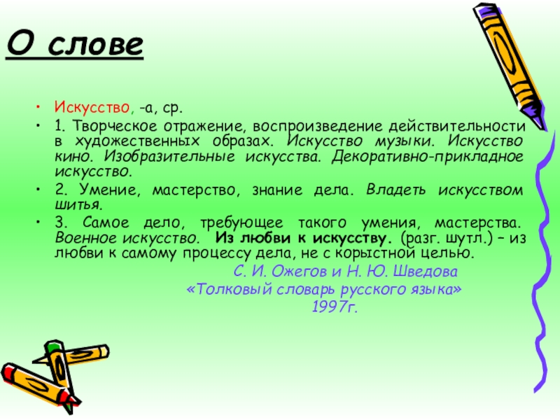 художественная деятельность. Произведение искусства. Деятели искусства. Русское искусство серебряного века. Искусство для (ради) искусства (теория, отвергающая общественное назначение искусства). Чистое искусство (название эстетических концепций, утверждающих самоцельность художественного творчества, независимость искусства от политики и общественных требований).