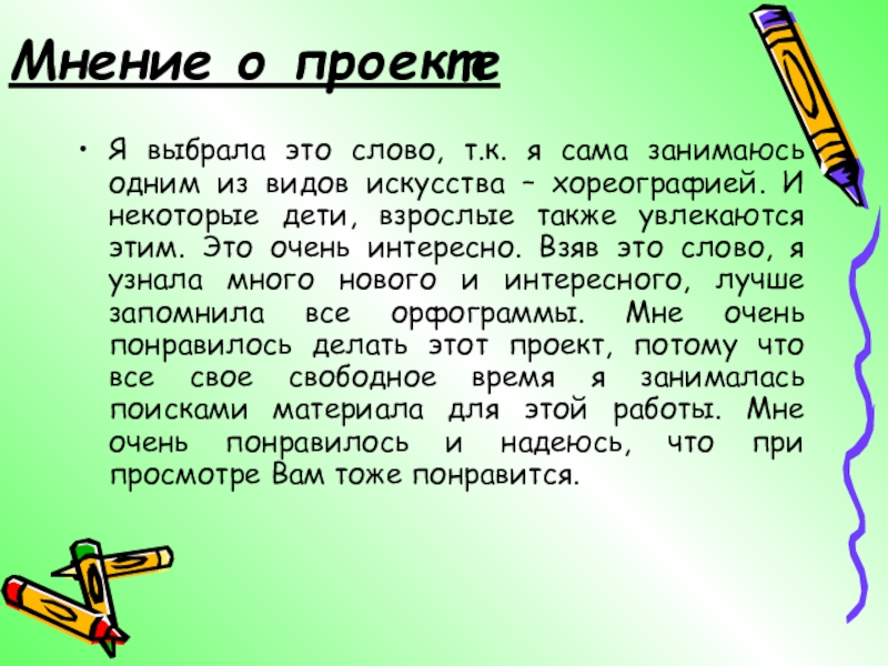 из видов искусства – хореографией. И некоторые дети, взрослые также увлекаются этим. Это очень интересно. Взяв это слово, я узнала много нового и интересного, лучше запомнила все орфограммы. Мне очень понравилось делать этот проект, потому что все свое свободное время я занималась поисками материала для этой работы. Мне очень понравилось и надеюсь, что при просмотре Вам тоже понравится.