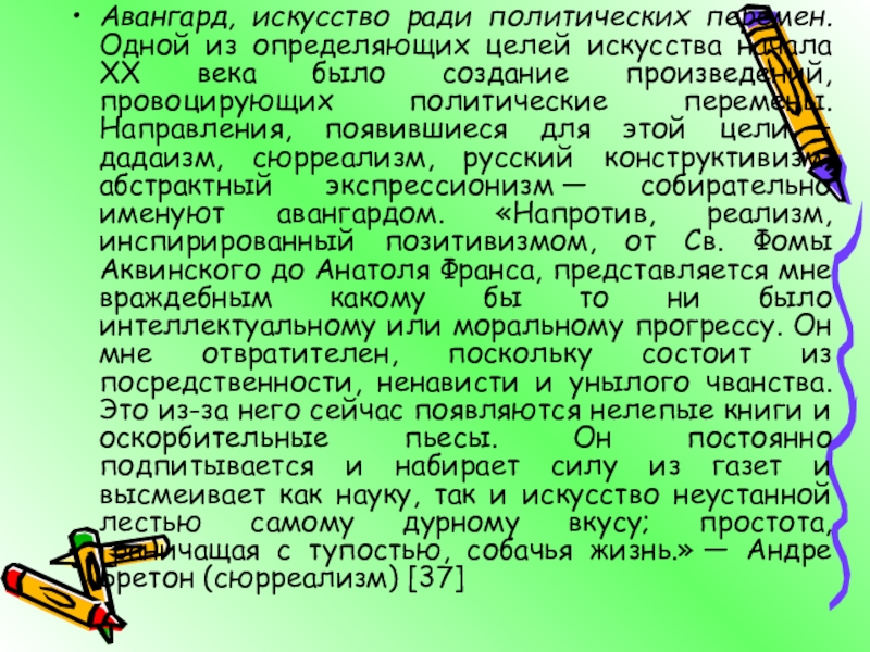 XX века было создание произведений, провоцирующих политические перемены. Направления, появившиеся для этой цели, — дадаизм, сюрреализм, русский конструктивизм, абстрактный экспрессионизм — собирательно именуют авангардом. «Напротив, реализм, инспирированный позитивизмом, от Св. Фомы Аквинского до Анатоля Франса, представляется мне враждебным какому бы то ни было интеллектуальному или моральному прогрессу. Он мне отвратителен, поскольку состоит из посредственности, ненависти и унылого чванства. Это из-за него сейчас появляются нелепые книги и оскорбительные пьесы. Он постоянно подпитывается и набирает силу из газет и высмеивает как науку, так и искусство неустанной лестью самому дурному вкусу; простота, граничащая с тупостью, собачья жизнь.» — Андре Бретон (сюрреализм) [37]