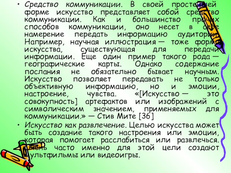 Искусство как развлечение. Целью искусства может быть создание такого настроения или эмоции, которая помогает расслабиться или развлечься. Очень часто именно для этой цели создают мультфильмы или видеоигры.