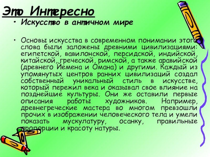 слова были заложены древними цивилизациями: египетской, вавилонской, персидской, индийской, китайской, греческой, римской, а также аравийской (древнего Йемена и Омана) и другими. Каждый из упомянутых центров ранних цивилизаций создал собственный уникальный стиль в искусстве, который пережил века и оказывал свое влияние на позднейшие культуры. Они же оставили первые описания работы художников. Например, древнегреческие мастера во многом превзошли прочих в изображении человеческого тела и умели показать мускулатуру, осанку, правильные пропорции и красоту натуры.